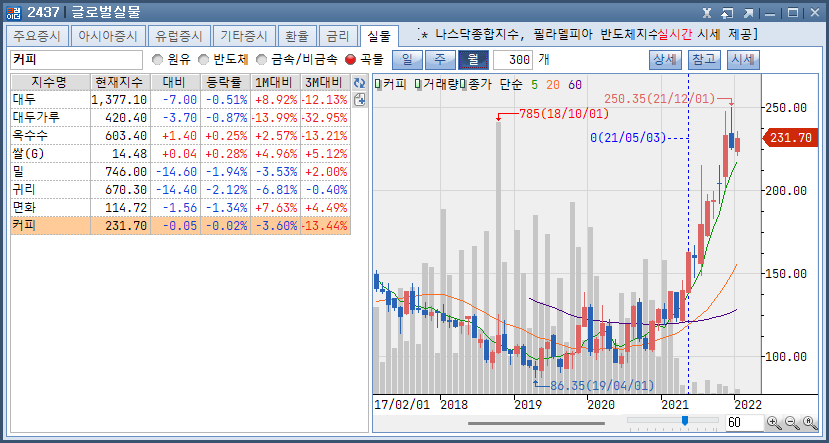 지난해 12월 6일 원두 선물은 250.35포인트로 최고치를 기록 후에 현재까지 하방 경직 현상을 보이고 있으며, 수렴구간을 거친 뒤에 재상승 가능한 위치에 있습니다.