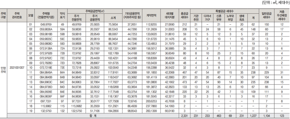 ● 최하층 우선 배정 세대(123세대)는 일반분양 총공급 세대(2,331세대)에 포함된 세대수이며, 97타입의 경우 일반분양(8세대) 모두 1층(최하층) 세대로 우선 배정과 무관하게 1층으로 배정됨