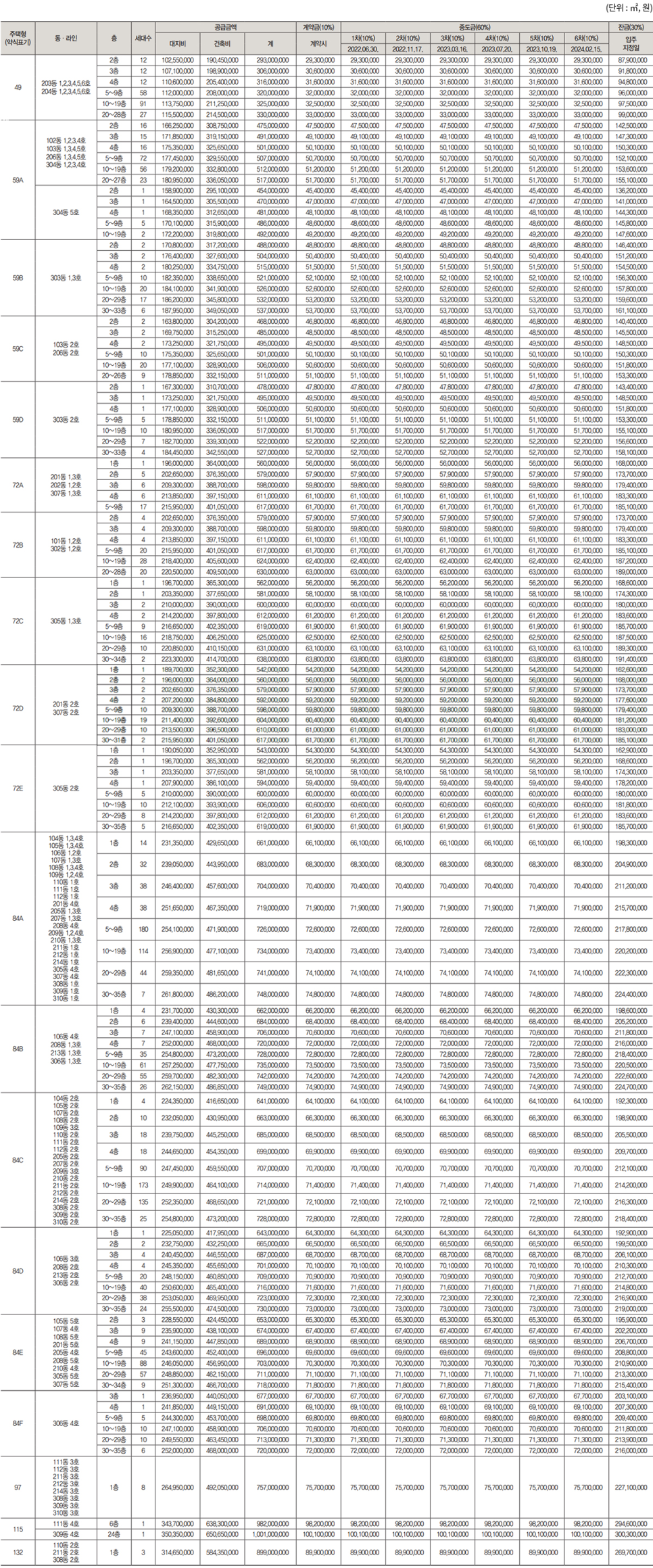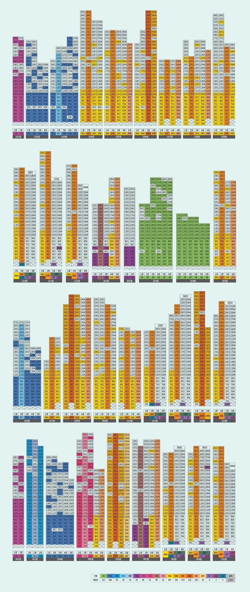 ● 상기 동·호수 표는 전체동 중 일반분양에 해당되는 동·호수만 컬러로 표기한 것이며, 제작 과정상 오류가 있을 수 있으니 반드시 견본주택에서 확인하시기 바랍니다.