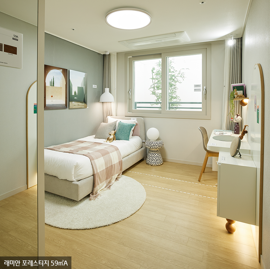자녀방으로 꾸며본 침실입니다. 붙박이장(유상옵션)을 설치하여 수납 걱정을 덜어보세요.