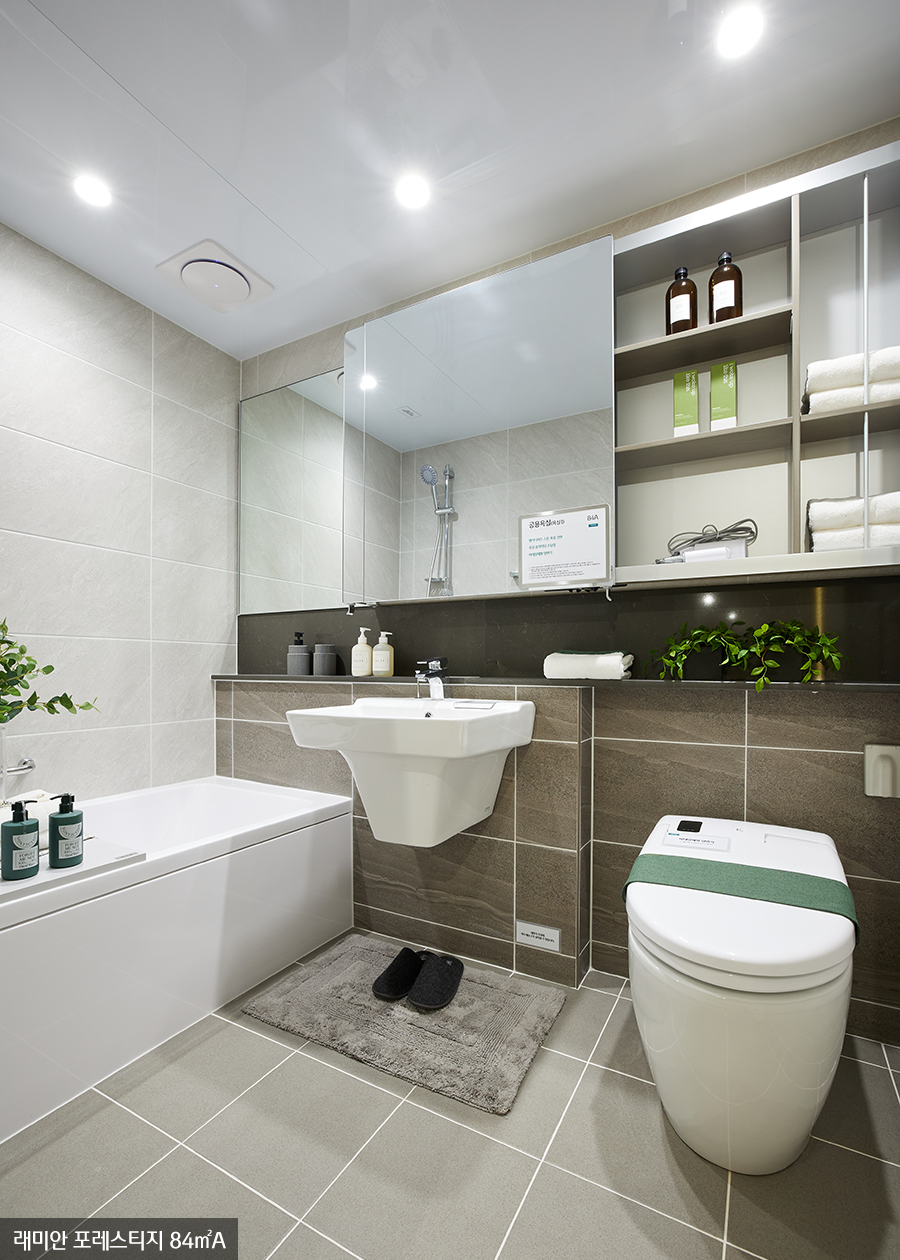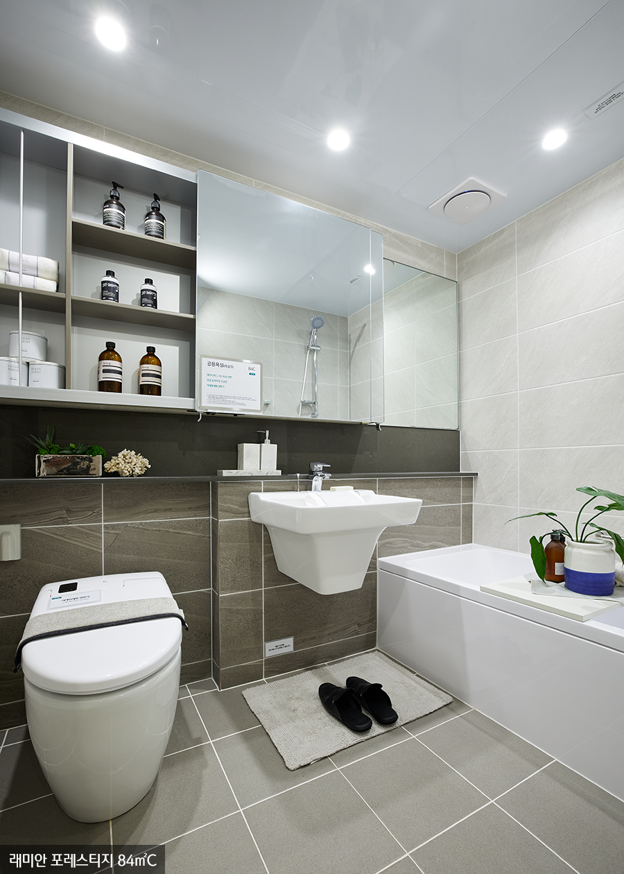 그레이톤의 내추럴한 석재 패턴으로 트렌디하게 연출한 부띠크 욕실1입니다. 엔지니어드 욕실 선반이 욕조까지 이어져 와이드한 공간감을 선사하고, 비데일체형 양변기, 욕실 슬라이딩 수납장이 제공됩니다.
