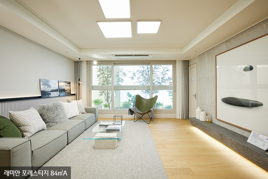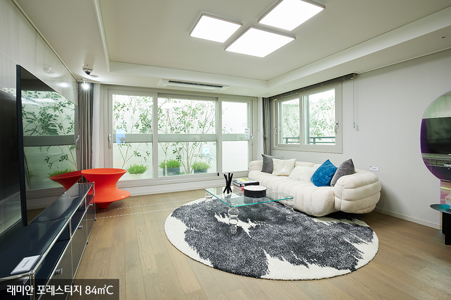 타워형 2면 개방 발코니 코너부 확장형으로 개방감이 돋보이는 거실입니다.