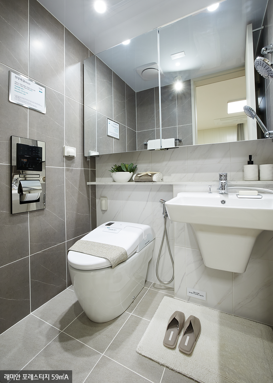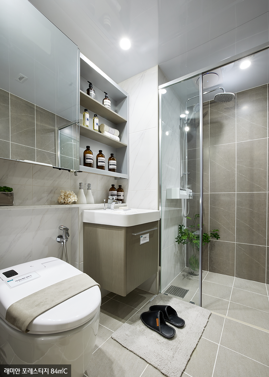 비데 일체형 양변기, 엔지니어드 욕실 선반, 욕실 슬라이딩 수납장, 욕실 하부장이 제공됩니다.
