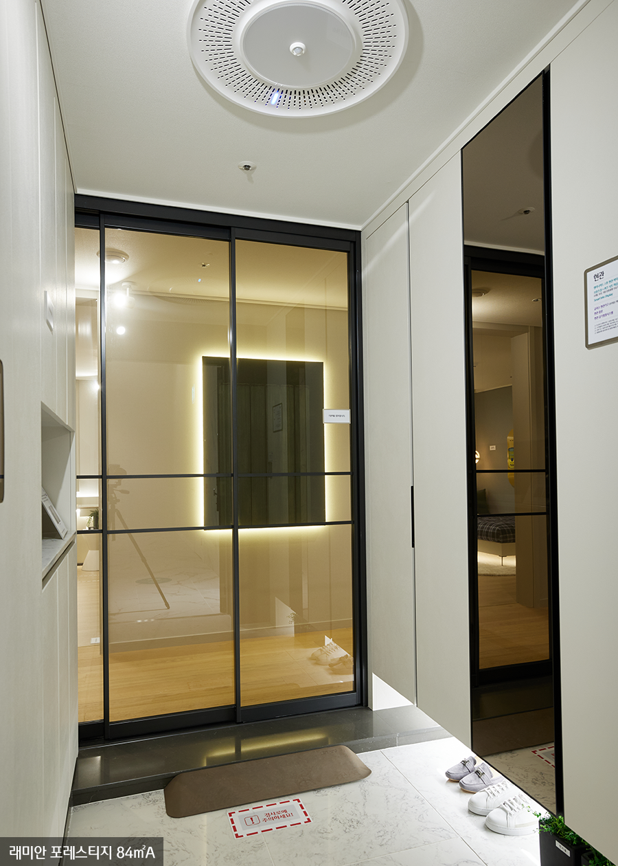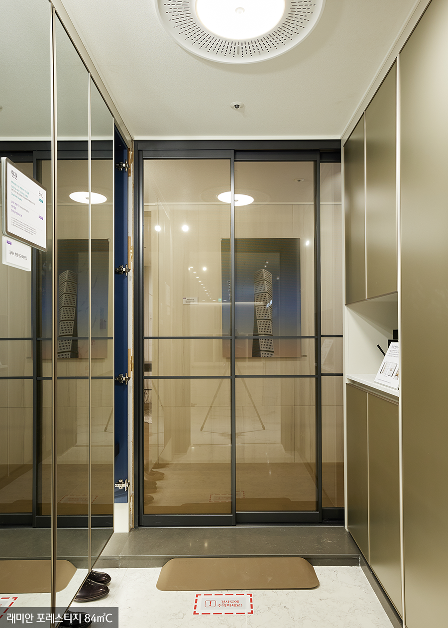 기본형 현관가구(기본제공), 중문(유상옵션), 공기청정시스템(유상옵션)이 설치된 현관입니다. 중문(유상옵션)을 설치하면 사생활 보호는 물론 방한, 방풍, 방음에 미적 감각까지 올라갑니다. 엔지니어드스톤 바닥과 디딤판은 고급스러움을 더하고, 신발장은 신발, 우산, 각종 운동용품 등을 풍부하게 수납할 수 있어 편리합니다.