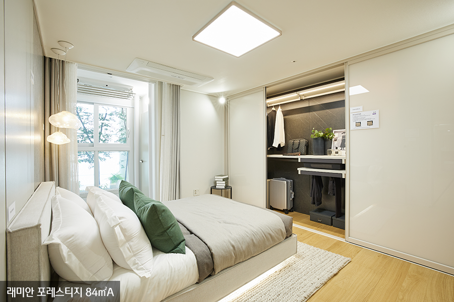 안방입니다. 슬라이딩장(유상옵션)을 설치하면 충분한 수납에 고급스러움까지 더할 수 있습니다.