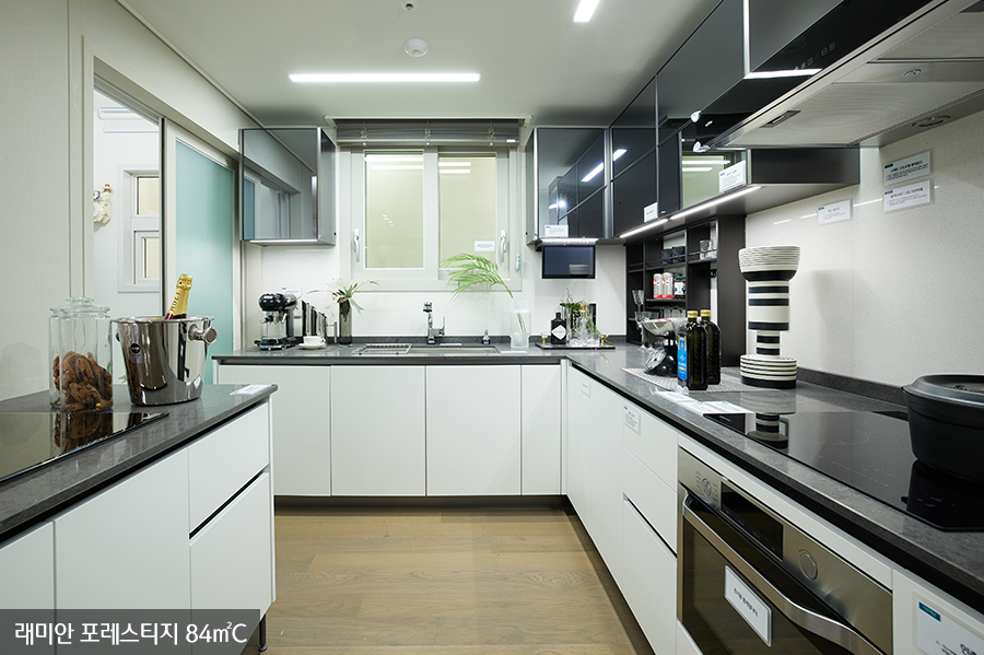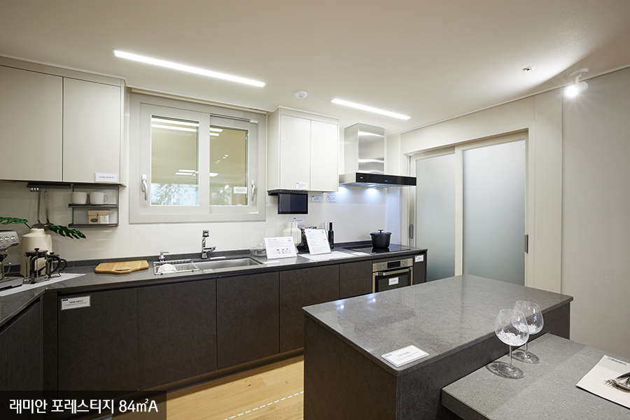 주방입니다. 유리 플랩장과 FENIX소재의 주방가구(유상옵션)로 기능성과 고급감을 살려 보세요.